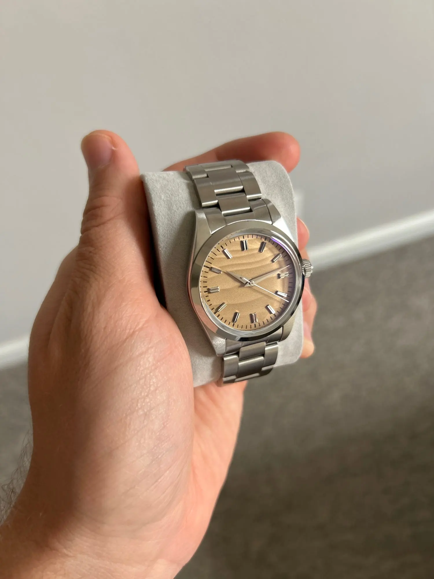 The Desert Royale Timepiece combines refined simplicity with rugged reliability. With its unique three-dimensional desert-pattern dial and lightweight stainless steel construction, this 36mm timepiece offers both everyday comfort and distinctive style.