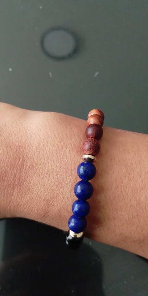Actual stones unlike another seller's product! Well made with a comfortable stretch to it. Unsure if the blue may be dyed, but if it is, it's still stone. Very pretty regardless if it works to attractive wealth and prosperity!